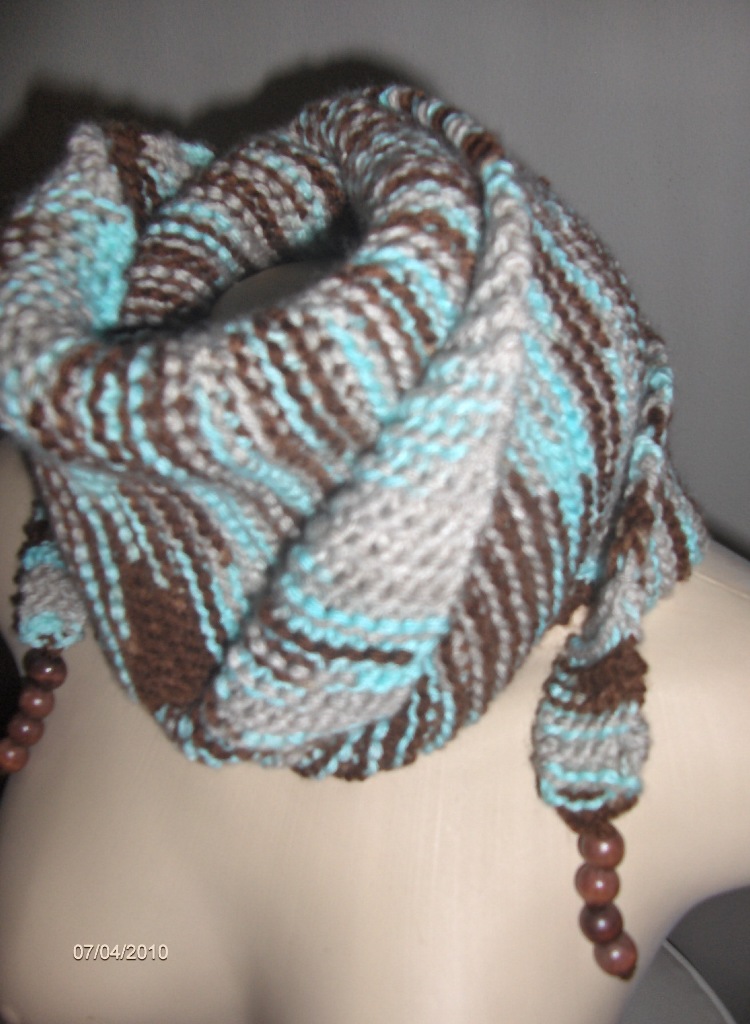 Cachecol feito com lã de espessura média em 3 tons com acabamento em contas de madeira.Receita Internacional.